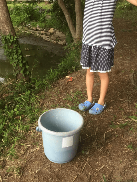 花小屋さんに少し寄った後は、短縮授業で早く買っている子供たちとザリガニ釣りに。